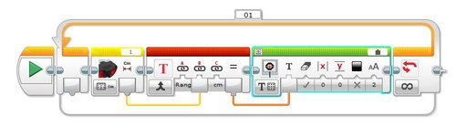 This example will take a reading from the Ultrasonic sensor connected to Port 1, combine it with some text, display on the screen and then continually update the screen with new readings.