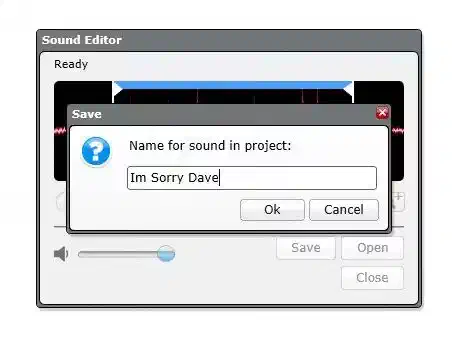 Press the ‘Save’ button when you’re happy with how it all sounds. Give your sound file a name that enables you to know what was recorded. ‘SoundEffect1’ is not a good name. ‘Im Sorry Dave’ is a much better name.