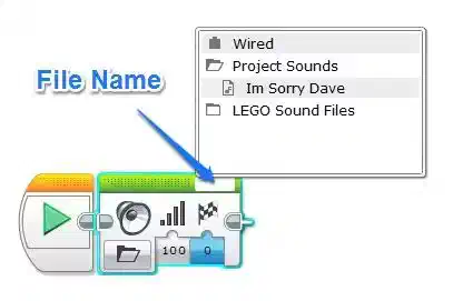 Once you’ve saved the file with an appropriate name, close down the Sound Editor to be returned to your normal Programming Canvas. Drag out a ‘Sound’ Block to use in your program. Click the ‘File Name’ section and go to the ‘Project Sounds’ section. If everything has gone to plan, you should see your new sound file there, ready to go!