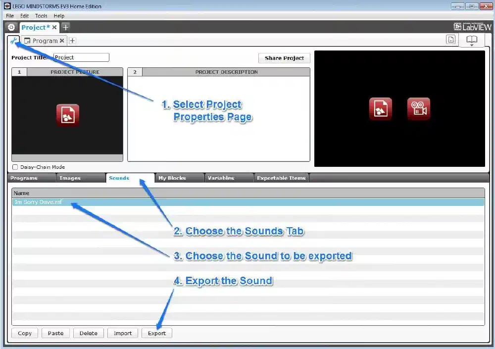To load the sound into a new Project, you’ll need to open your new Project and go to the Project Properties Page. Press the ‘Import’ button and locate where you had previously exported your sound file. Once imported, you’ll find you’re new sound file in the ‘File Name’ section of the Sound Block.