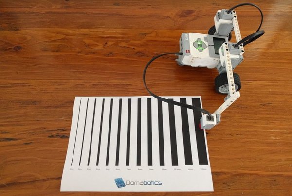 Setup the robot over the paper, and run the experiment. I then moved the Colour Sensor up one Technic hole on the boom arm, and ran the experiment again. I did this for a total of 4 different Sensor heights.