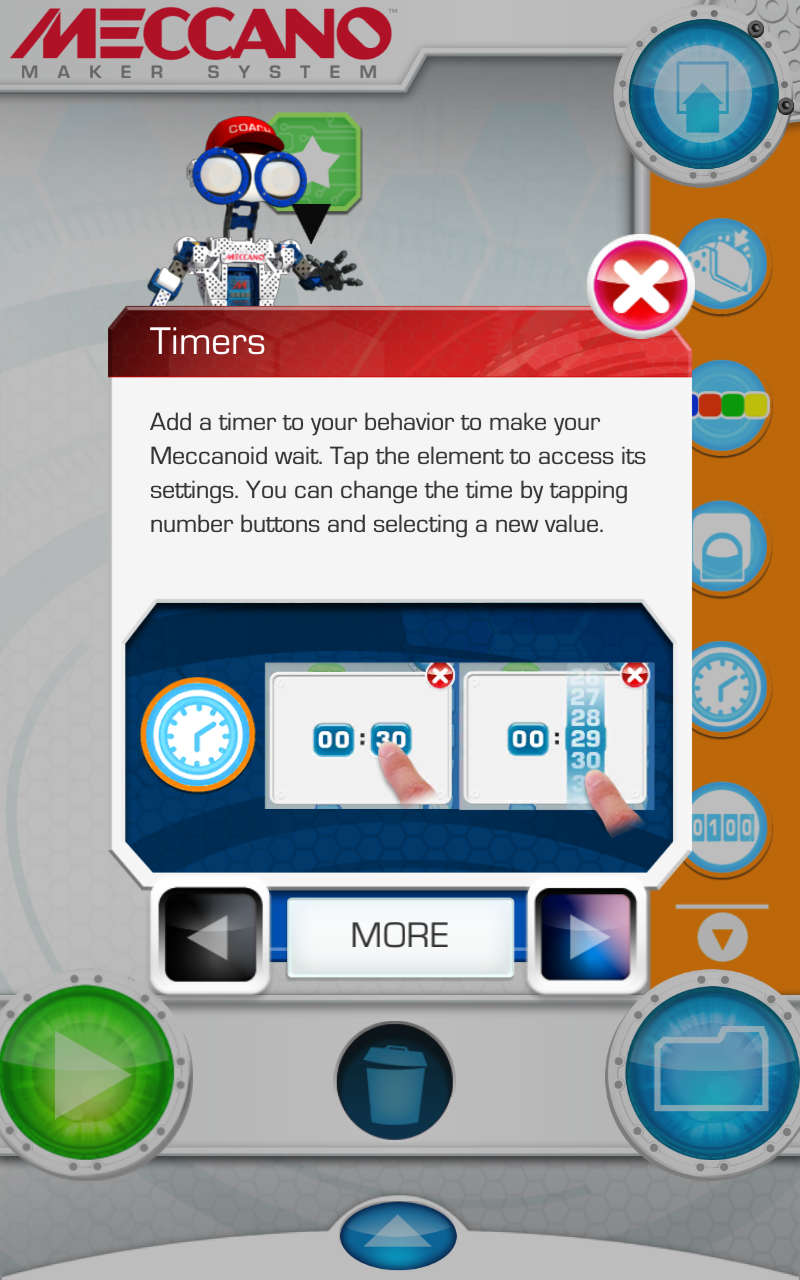 The side palette toggles between inputs and outputs. On the inputs side, you can trigger the next action based on a few different things – Timer, Counter (To use as a FOR loop), Meccanoid Brain buttons or the Servo angle. This last one was the most fun, as you can trigger actions by lifting the arms of the robot or something similar.