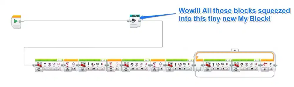 My Blocks are a way to represent lots of instructions with just a single block. What that means is that you may have a very long program, and just by the nature of such a large program it might be difficult to see at a glance what is happening within the code. My Blocks allow you to ‘chunk’ out the program into meaningful chunks that makes it easier to both program and more importantly debug. So what would that look like in a real program.