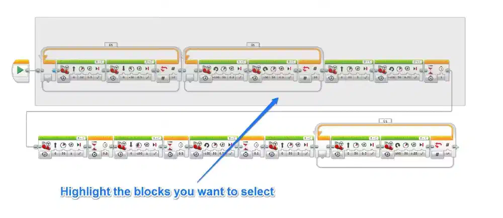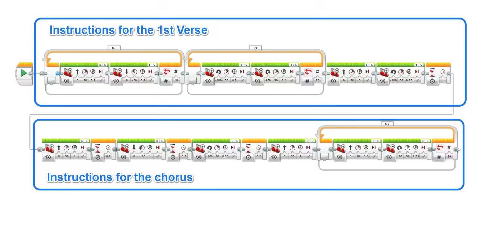 That is starting to get quite large as there are lots of movements within the program. What would be nice is if we could take all the parts relating to the robot dancing to the first verse of the song and create a single block to represent this.