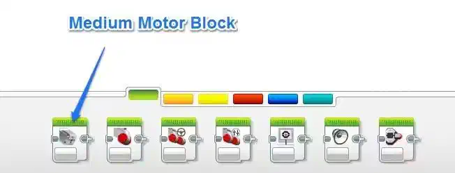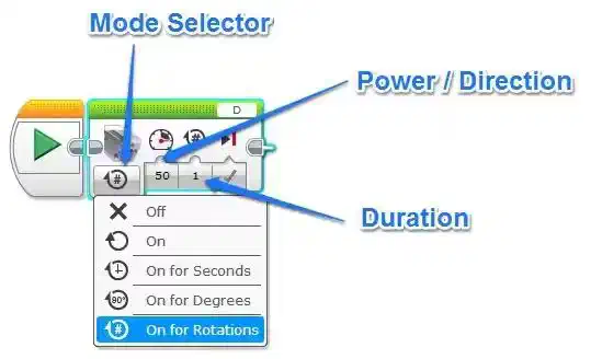 The block is used in a very similar way to the Move Steering Block, with the ability to change the speed, direction and the power level.  In the Mode Selector area you can choose one of the following options for your Medium Motor.