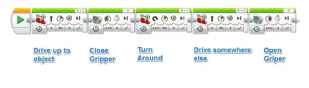 If the gripper motor is programmed to close for 4 seconds (as in the above example), then even if the object is grabbed after 3 seconds, the program can continue on after the 4 seconds has passed.