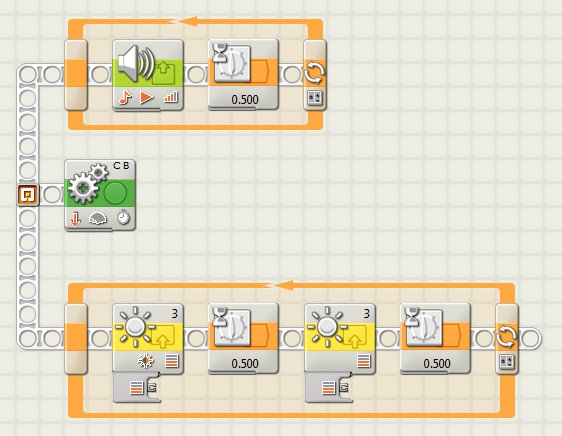 Becasue all three lines run on their own sequence bar, they will be executed in parallel, that is, the robot will reverse, beep and flash the light all at exactly the same time.