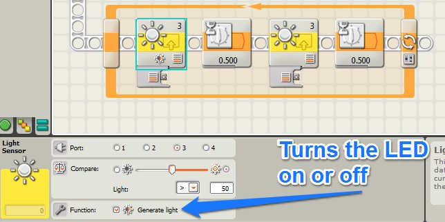 The third line uses the Light Sensor block, not to take a measurement, but to toggle the ‘Generate Light’ function that is used when using the Light Sensor in either Ambient or Reflected mode.