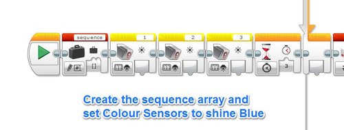 Take the random number, if it is 1, play a low note and briefly change Colour Sensor 1 to red and then back to blue. If the random number is 2 or 3, play a medium / high note and flash the appropriate Colour Sensor.