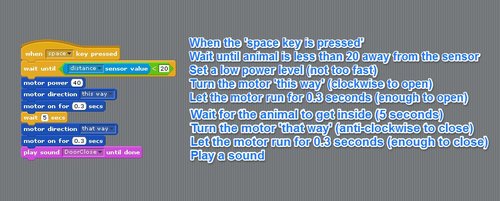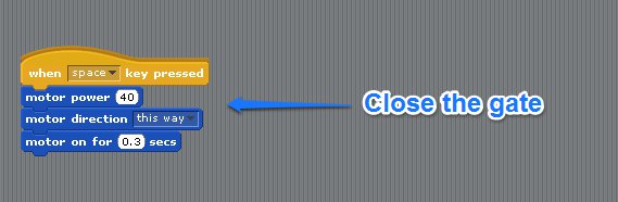 We did simple programs to open and close the gate based on a keyboard press and then introduced the distance sensor. This was the framework of the final program that the students did, although most decided to customise with extra sounds and speech bubbles!